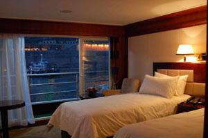 2、住宿:所预定游船标间,1个人用1个床位(平铺、空调、彩电、独立卫生间)